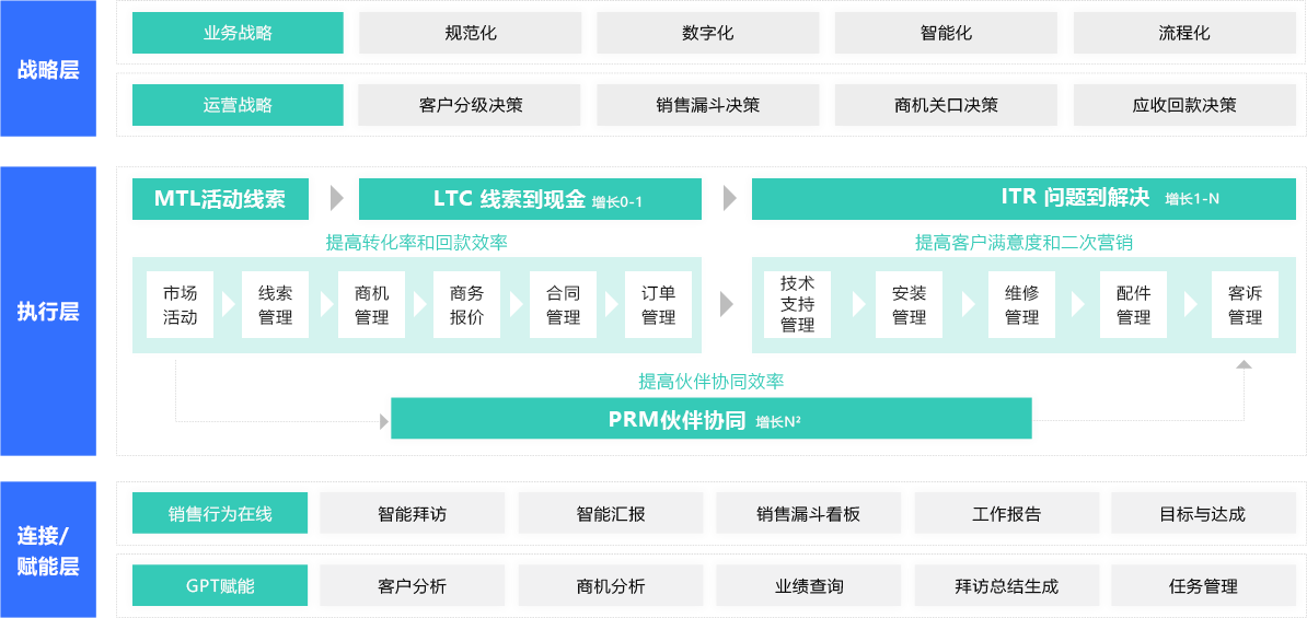 通过LTC+ITR构建企业销售服务一体化业务闭环能力,结合PRM打造高效伙伴协同能力,赋能业绩规模化增长。